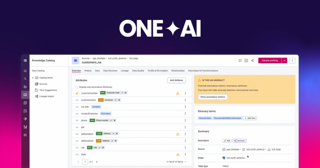 AI增强:Ataccama ONE 的一个关键特点是其 AI 增强功能,它通过自动化采样数据,让分析师能够快速发现有趣的模式,并应用机器学习算法为重新组织信息和整理提供建议。