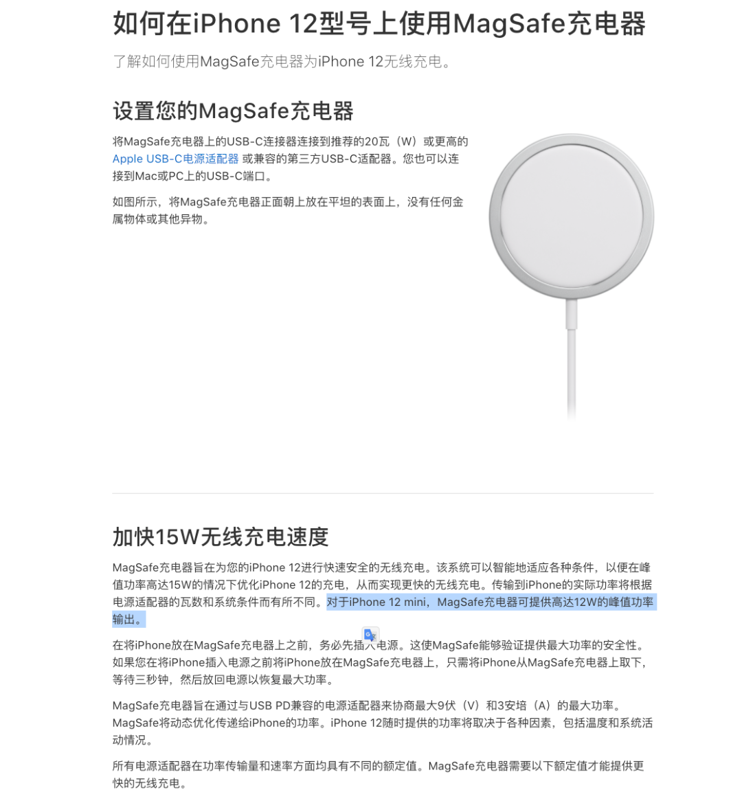 ③iPhone 12 mini无线充电功率缩水:苹果官网表示使用MagSafe充电器给iPhone 12 mini进行无线充电时功率最高为12W(而iPhone 12/Pro最高是15W);