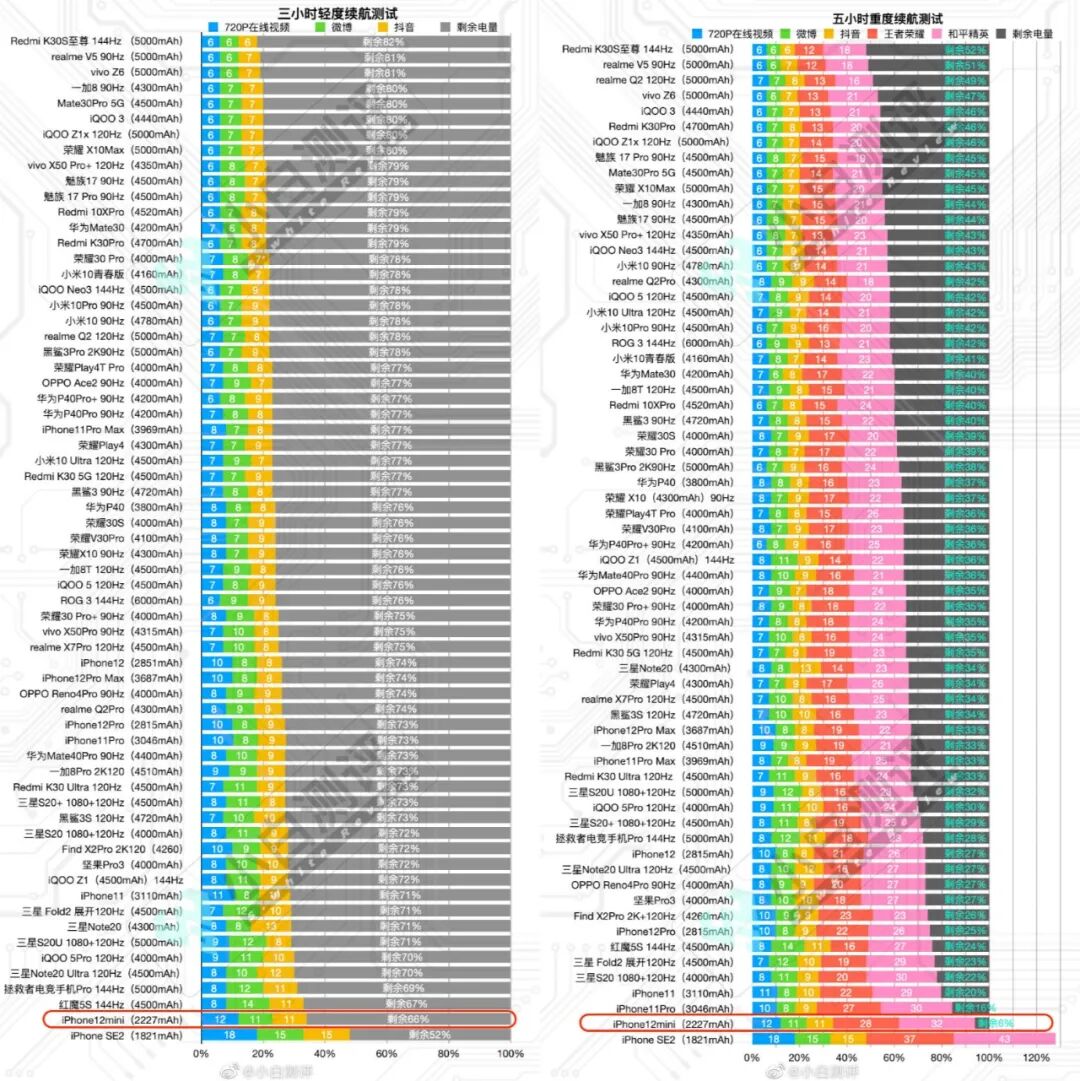 ①iPhone 12 mini机身小→电池容量小→续航可想而知(小白测评数据库实测iPhone 12 mini在WiFi状态下重度续航堪堪五小时,4G/5G状态下势必会耗电更快);