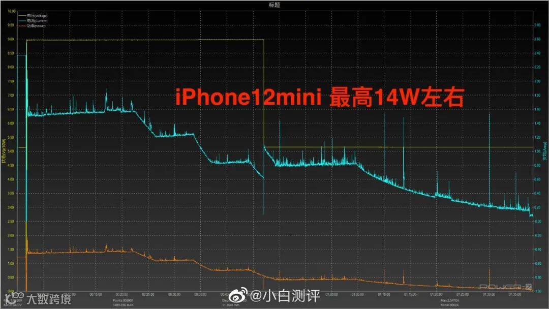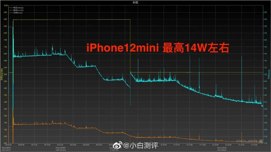 ④iPhone 12 mini有线充电功率缩水:小白测评数据库实测使用苹果的20W官方充电器,iPhone 12 mini实际功率14W左右,而iPhone12/Pro 实际18W左右,iPhone12Pro Max 实际接近20W。
