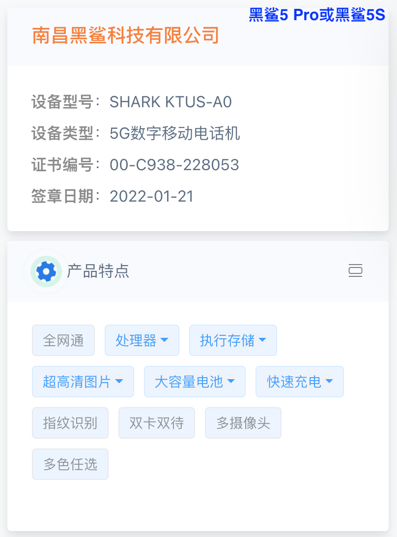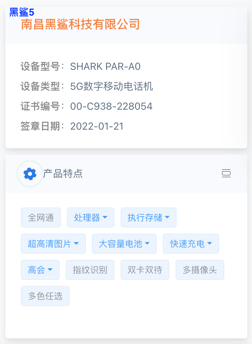 虽然黑鲨被腾讯收购传闻闹得沸沸扬扬,但并不影响黑鲨5系列新机的发布,日前黑鲨5系列手机官方预热,搭载全新高通骁龙8移动平台,即将硬核登场,前两天黑鲨5系列被发现已经现身工信部,今天在3C认证也能查询到相关信息了。
