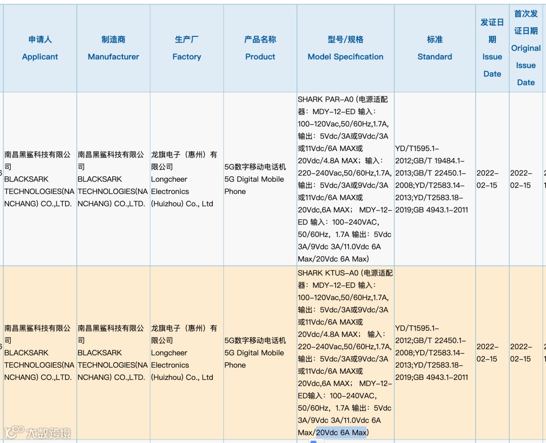 如上图所见,黑鲨型号为SHARK PAR-A0、SHARK KTUS-A0的两款5G新机在2月15日获得3C认证,均配备120W快充。