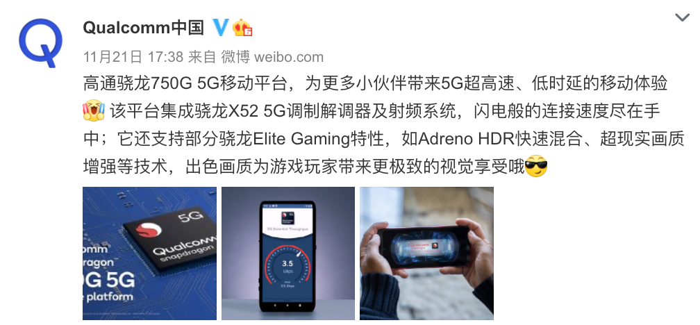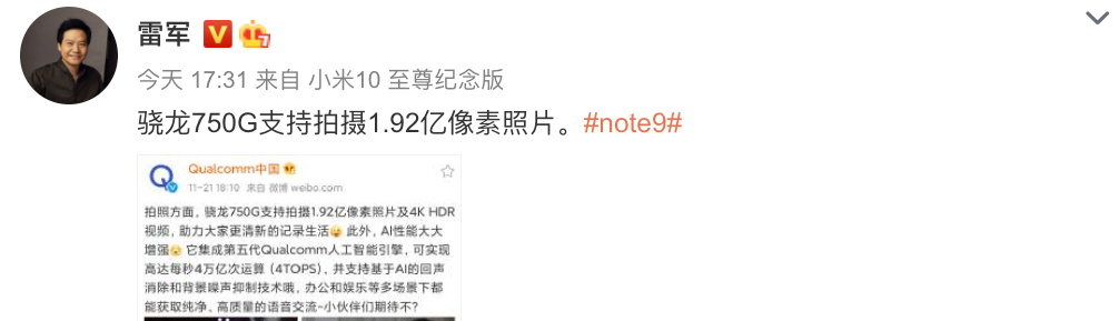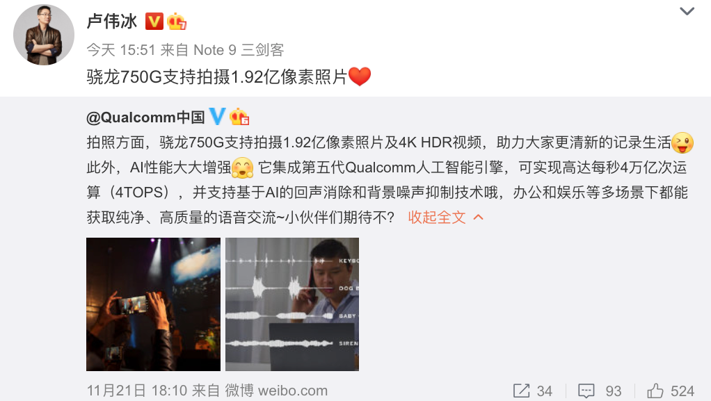 如上图所见,卢伟冰和高通纷纷发文预热骁龙750G的表现。