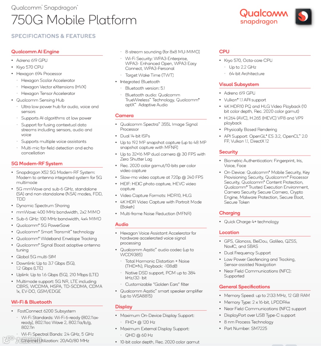 其他规格上,骁龙750G最高支持LPDDR4x 2133MHz,支持WiFi 6、蓝牙5.1,最大支持FHD+分辨率120Hz / QHD分辨率60Hz屏,单相机最高支持192MP和4K HDR视频等等。