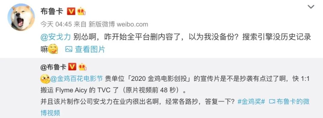据悉,涉嫌抄袭的2020金鸡电影创投宣传片制作公司是「安戈力」,有业内人士称其还是个惯犯,目前该制作公司和金鸡奖尚未进行任何回应。