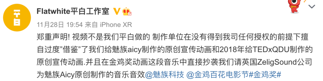 据魅族Aicy广告片的制作单位表示,涉嫌抄袭的金鸡电影创投宣传片