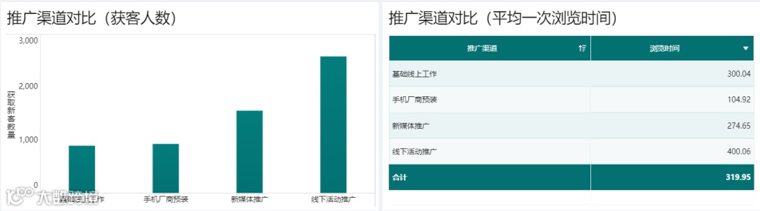通常情况下渠道分析有两个维度:获客数量和获客质量。(在本文中我们以平均打开 APP 的浏览时间作为获客质量评价标准,不同企业实际运营过程中有不同的评价指标)