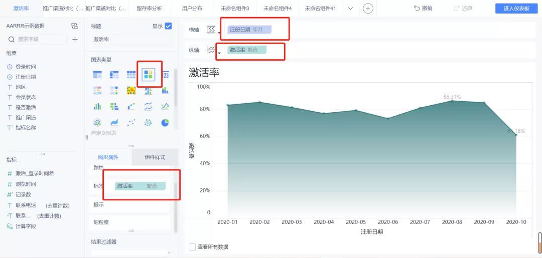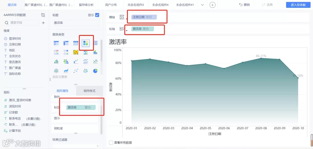 首先通过柱状图来观察渠道获客人数对比,将最左边维度中的推广渠道和获客数量分别拖至横轴和纵轴中: