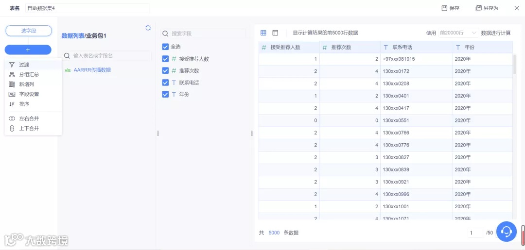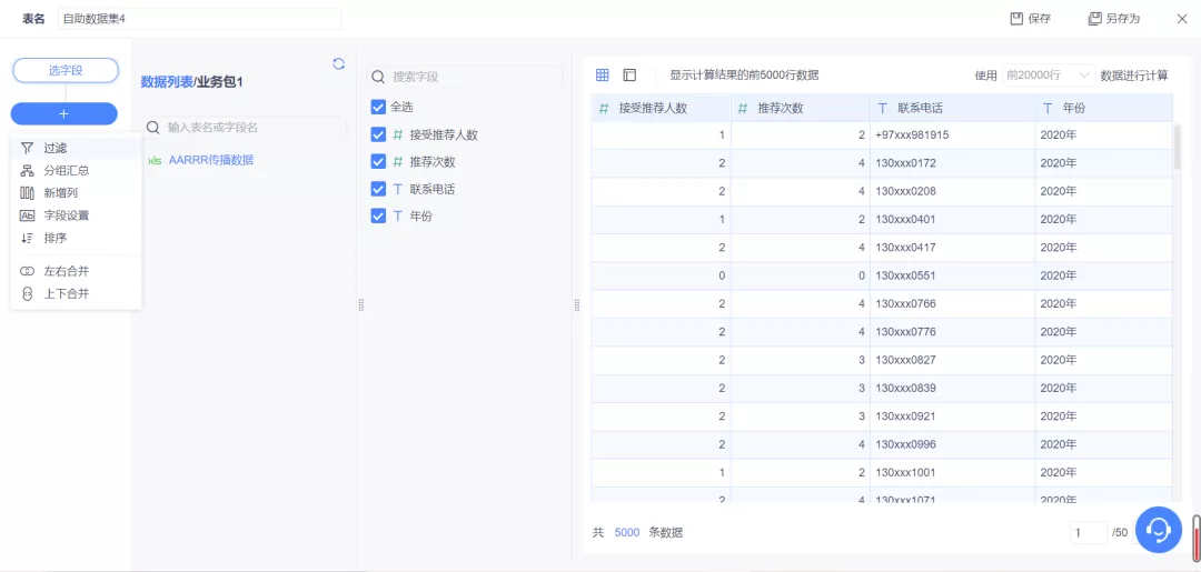 FineBI当中,只需要通过编辑字段即可完成数据处理,比如常见的过滤功能、分组汇总功能、新增列、排序功能、合并功能等等;