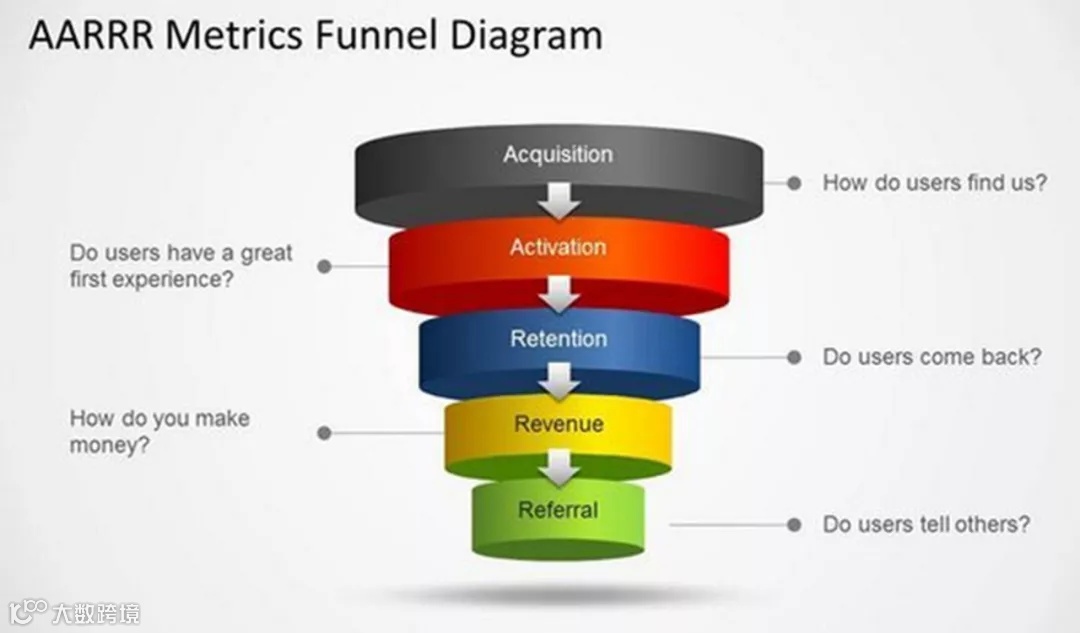 那么为什么这些方法对于用户增长来说,如此有效呢?这其中就涉及到了一套用户运营模型AARRR模型,也称海盗模型,AARRR是Acquisition、Activation、Retention、Revenue、Refer,这个五个单词的缩写,分别对应用户生命周期中的5个重要环节:获客、激活、留存、收益、传播。