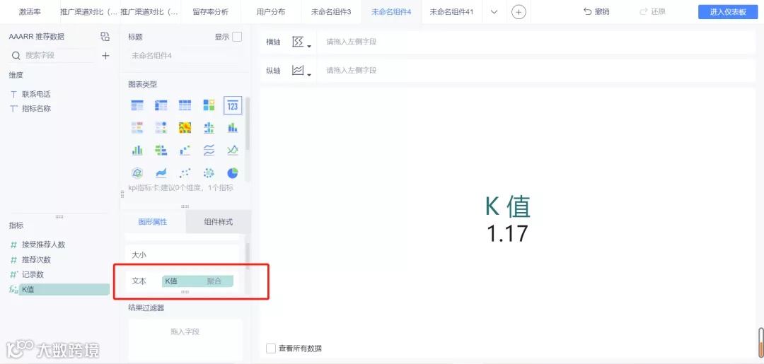 为了方便观察,可以将K值制作成文本组件展示于仪表板中,只需将指标中的K值拖拽至本文属性中,如下图所示;