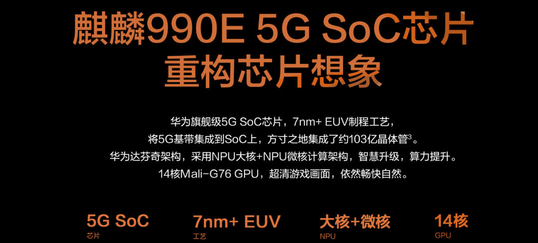 详细规格上,官网显示麒麟990E基于7nm Euv工艺,集成5G,采用八核CPU 2*A76@2.86GHz + 2*A76@2.36GHz + 4*A55 @1.95GHz,GPU为14核Mali 76,NPU为大核+微核。