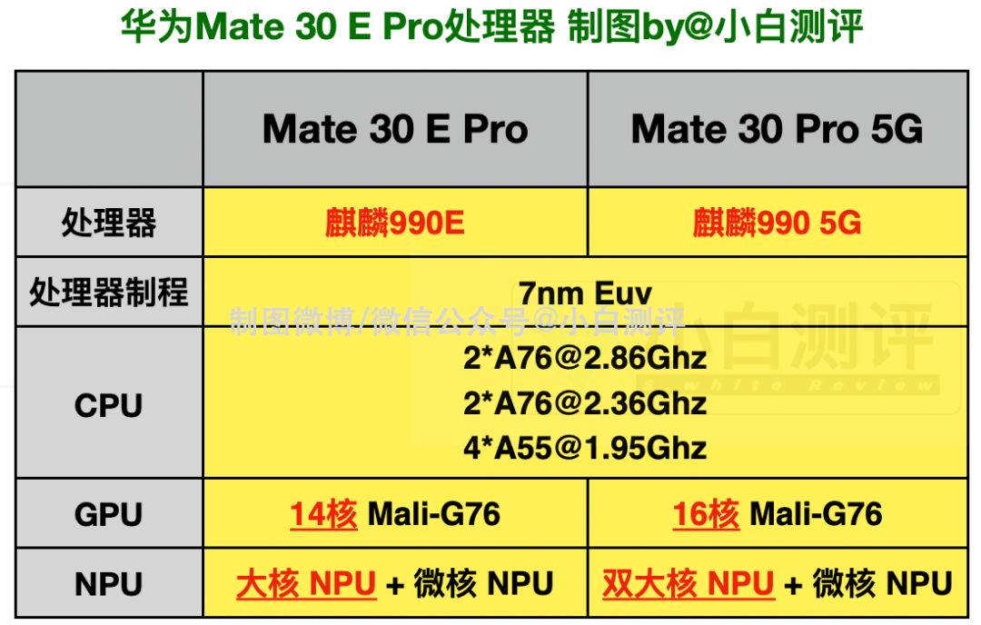 小白对比Mate 30 Pro 5G的参数发现Mate 30E Pro仅处理器发生了变化:从麒麟990 5G变成了「麒麟990E」处理器。