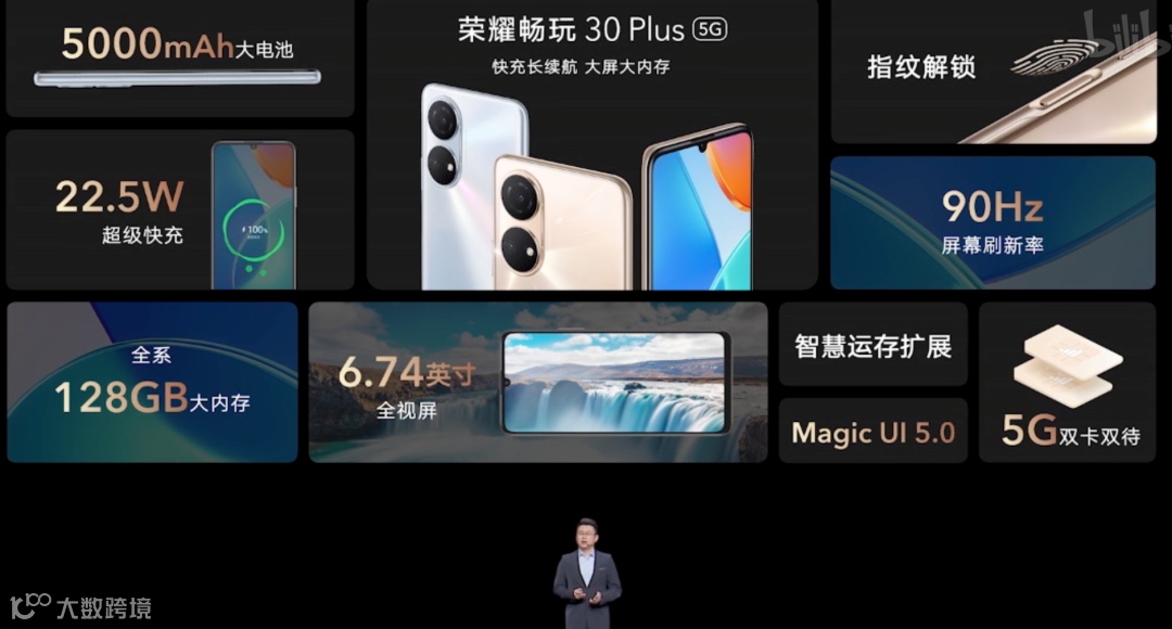 核心配置上,荣耀畅玩30 Plus前置5MP,后置双摄13MP主摄+2MP景深,搭载联发科天玑700处理器,5000mAh电池+22.5W充电,保留3.5mm耳机孔,运行基于Android 11的Magic UI 5.0,支持运存拓展。