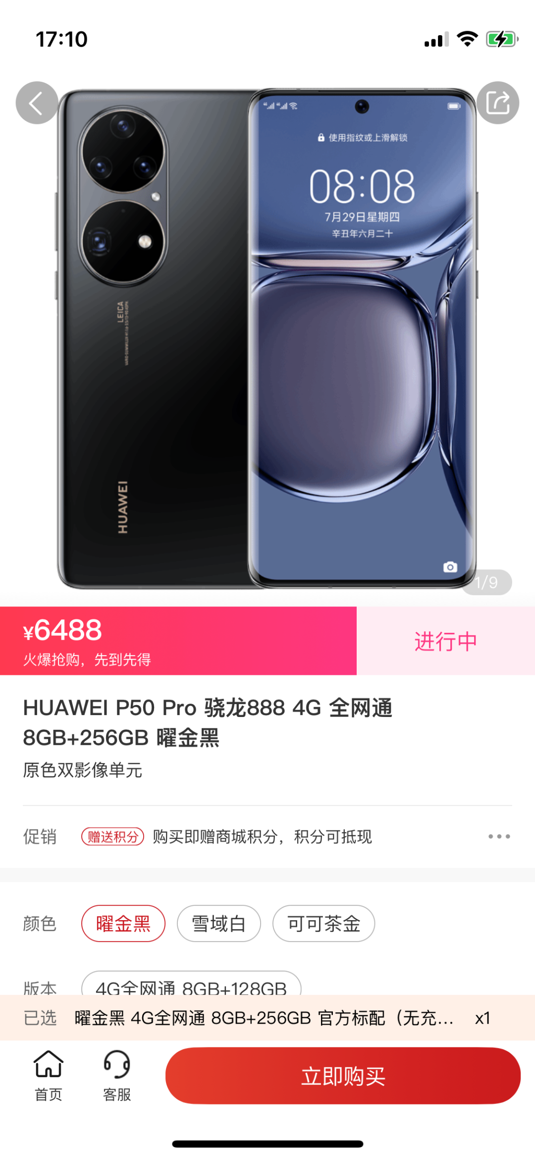 具体华为P50系列的配置参数【图文汇总】戳这里回顾,P50 Pro上手体验【视频】戳这里回顾。今天下午17点左右到华为商城查看,8+128GB版暂时无货,8+256GB版还可以购买。