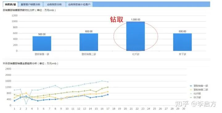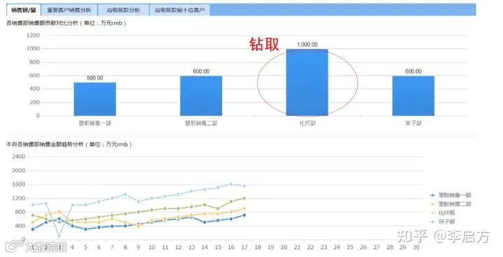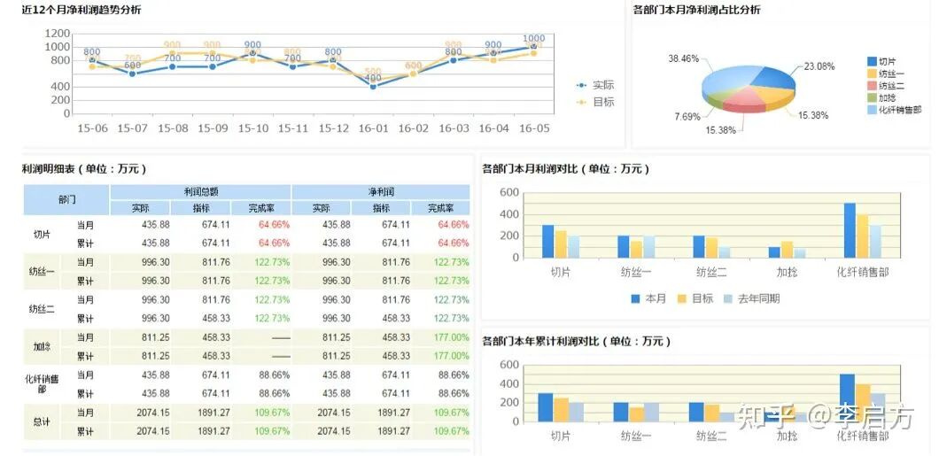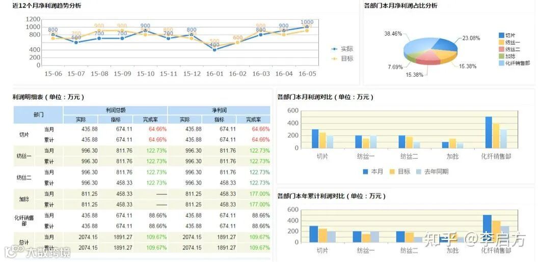 这里需要用到一些财务分析的工具了,我之前用FineBI,上面这些图就是FineBI做的,但是FineBI更偏向财务人员的自主数据分析,如果企业数据量很大,还是得老一套流程,财务人员提需求,IT人员开发,最后由财务总监和管理层去看这份报表。