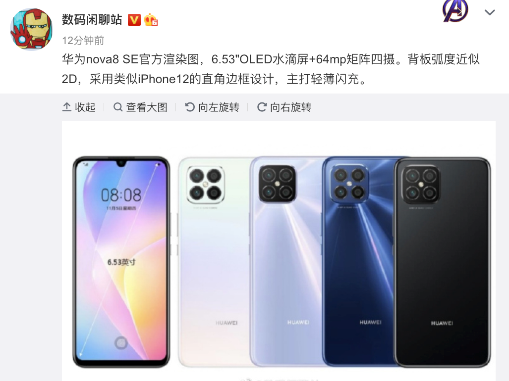日前刚刚发布的华为Mate 40系列终于刷新了华为家族的有线快充, 从40W升级为了66W,万万没想到这么快中低端机也有搭载66W闪充的新机了,据爆料达人透露,华为nova 8 系列已经在路上,其还披露了 nova 8 SE 的外观和详细参数。 如上图所见,外观上,华为 nova 8 SE 采用6.53英寸FHD+分辨率的OLED水滴屏,无高刷,前置1600万像素,后置左上角浴霸四摄6400万+800万+200万+200万,机身厚度重量分别为7.46mm和178g。 核心配置上,爆料表示华为 nova 8 SE 搭载联发科天玑720处理器支持双模5G,nova 8或搭载联发科天玑800U处理器,电池容量3800mAh(估计是额定值?典型值一般都是4000mAh),还有66W闪充,整体主打轻薄和闪充,细节上爆料还提到nova 8 SE采用类似iPhone12的直角边框 nova系列应该也是华为更新最快的一个系列了 近期热点