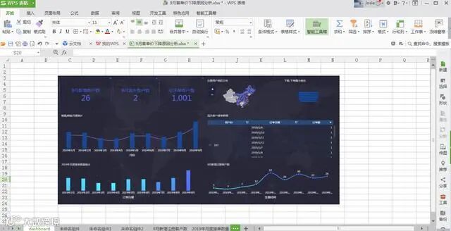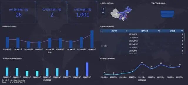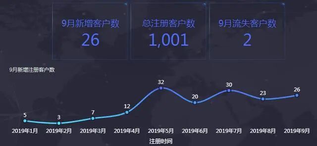从用户注册表、用户信息表中获取总注册用户数、9月新增注册数和9月流失用户数,使用指标卡组件计算出9月新增客户数为26、流失客户数为2,根据2019年新增注册客户数折线图,可以看出9月新增客户数在正常变化幅度内。