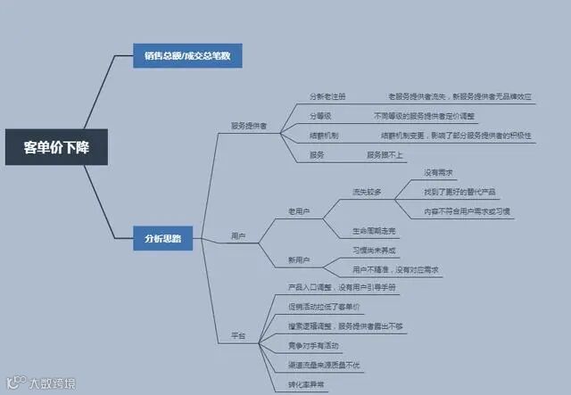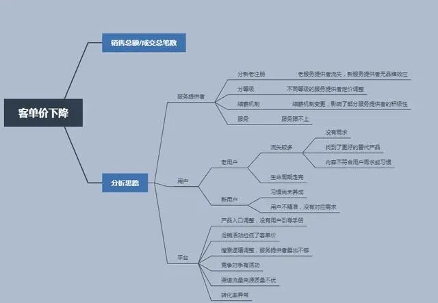 首先清楚这是典型的分析为什么的问题,其二确定分析思路,根据归纳推理原理,从结论出发,进行拆解,客单价等于销售总额/成交总笔数,影响销售总额和成交总笔数不外乎服务提供者、用户和产品三个维度,从这三个维度下提出假设(如图),再通过数据逐一验证,以下使用样式数据,演示分析过程。