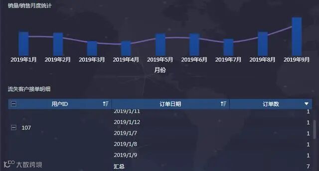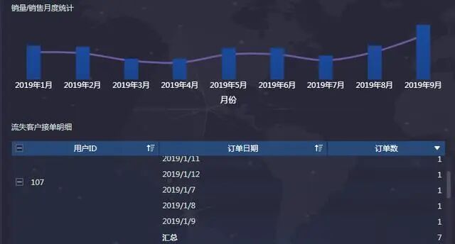 使用订单明细表得到2019年订单量/销售额月份变化趋势图及9月流失客户订单明细表。