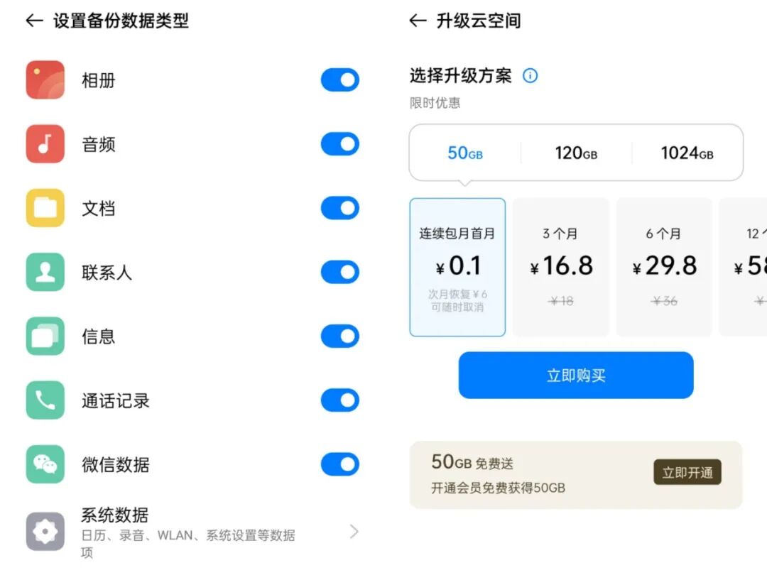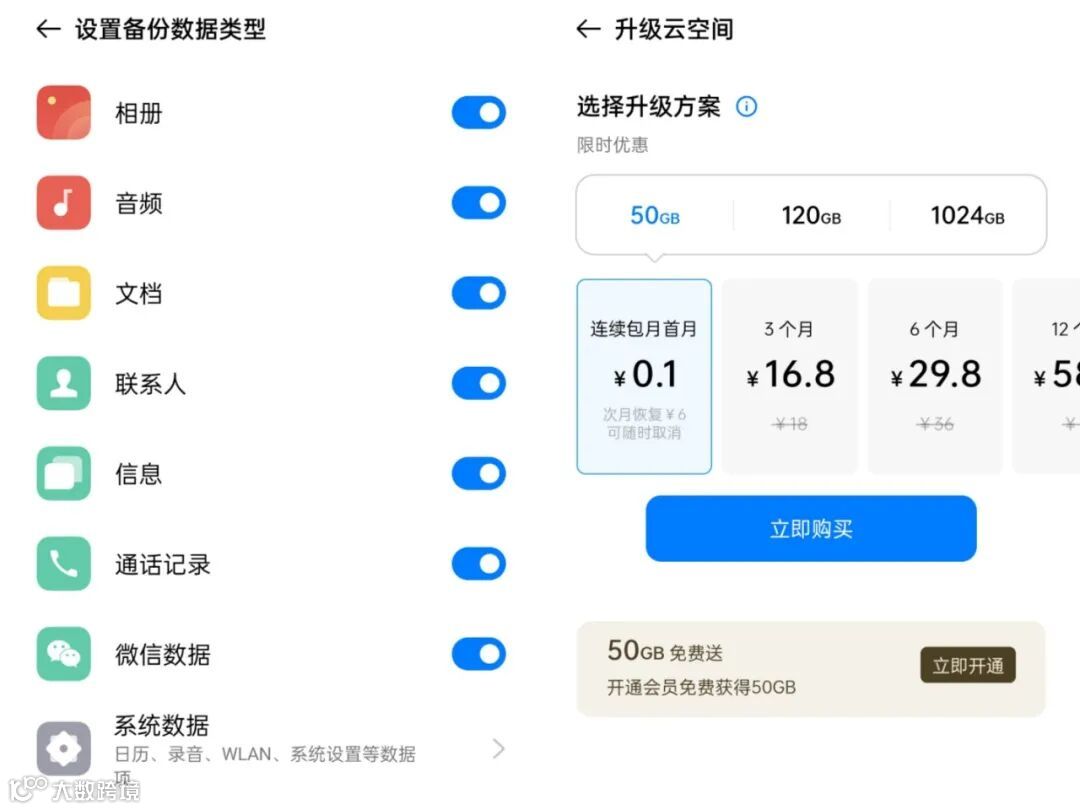 不过需要注意的是,小白看了下普通用户的云备份储存空间只有5GB,根本不够用,如果升级成50GB新用户包月是6元/1月(首月0.1),但感觉也不够用