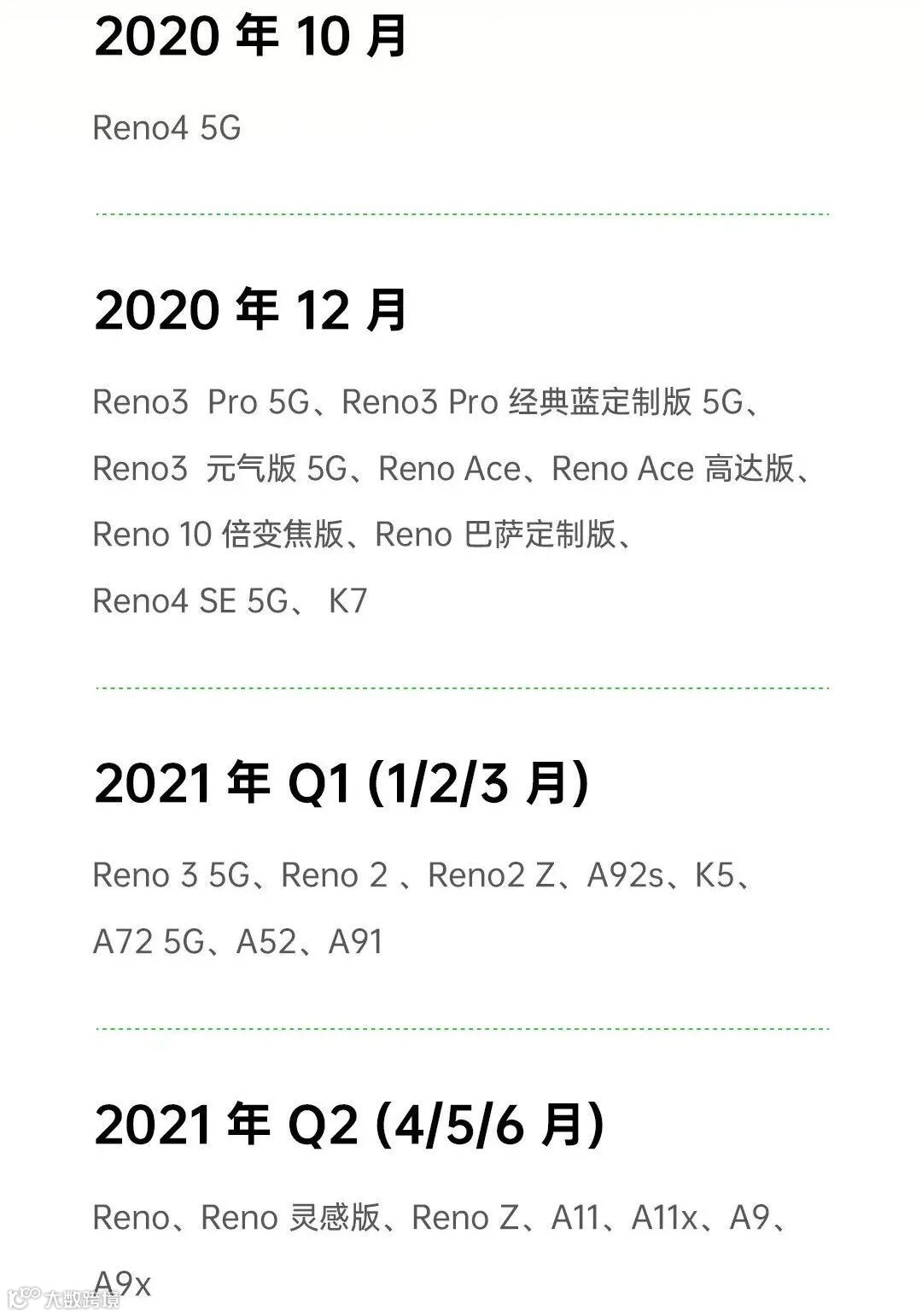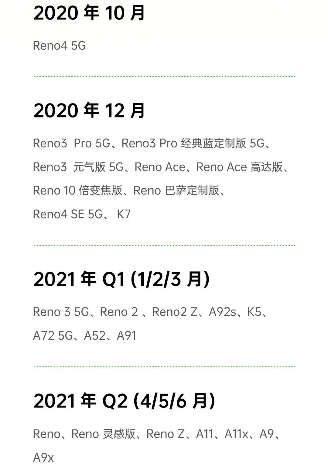 至于升级计划,官方表示ColorOS 11将覆盖33款机型,包括Find X2/Pro/兰博基尼版、Ace/Ace 2系列,Reno4/Pro系列,Reno3/Pro系列,Reno/2/Z/灵感版/10倍变焦版/巴萨定制版,A11/A52/A72/A9/K5/K7等。