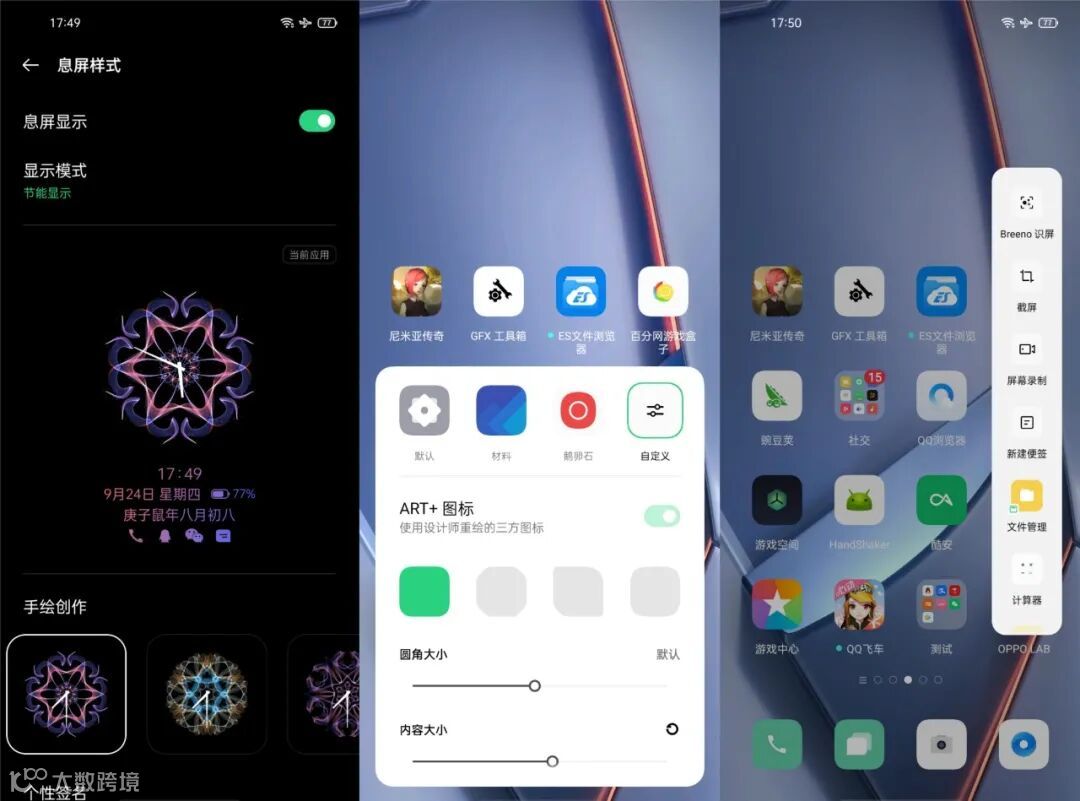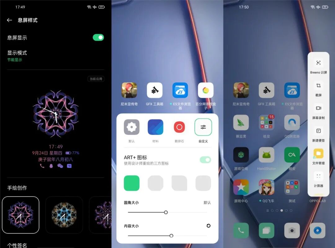 UI部分,ColorOS 11带来了无限息屏,手绘息屏,OPPOSans 2.0,创作铃声,桌面图标用户自定义,定制指纹样式、颜色、通知中心,暗色模式支持调节深浅度,OPPO Relax收集城市声音,新增智能侧边栏 Breeno识屏快捷入口。
