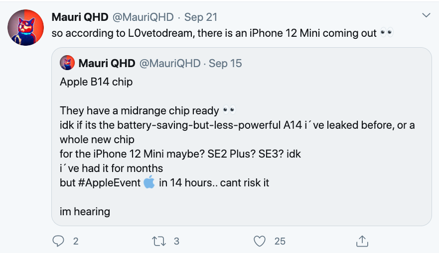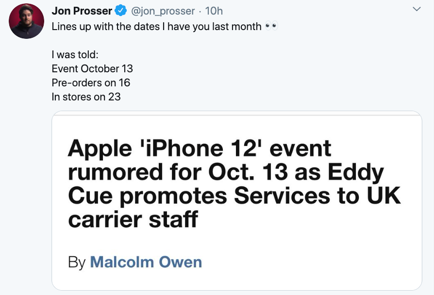 而和之前爆料一样, 今天爆料达人 JonProsser 的消息也是 10 月 13 日发布,国内应该就是 10 月 14 号凌晨。其还表示 iPhone 12 系列将于 10 月 16 日开启预售, 10 月 23 日正式开售。