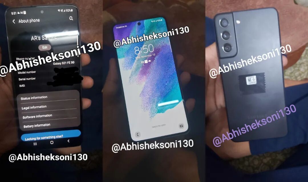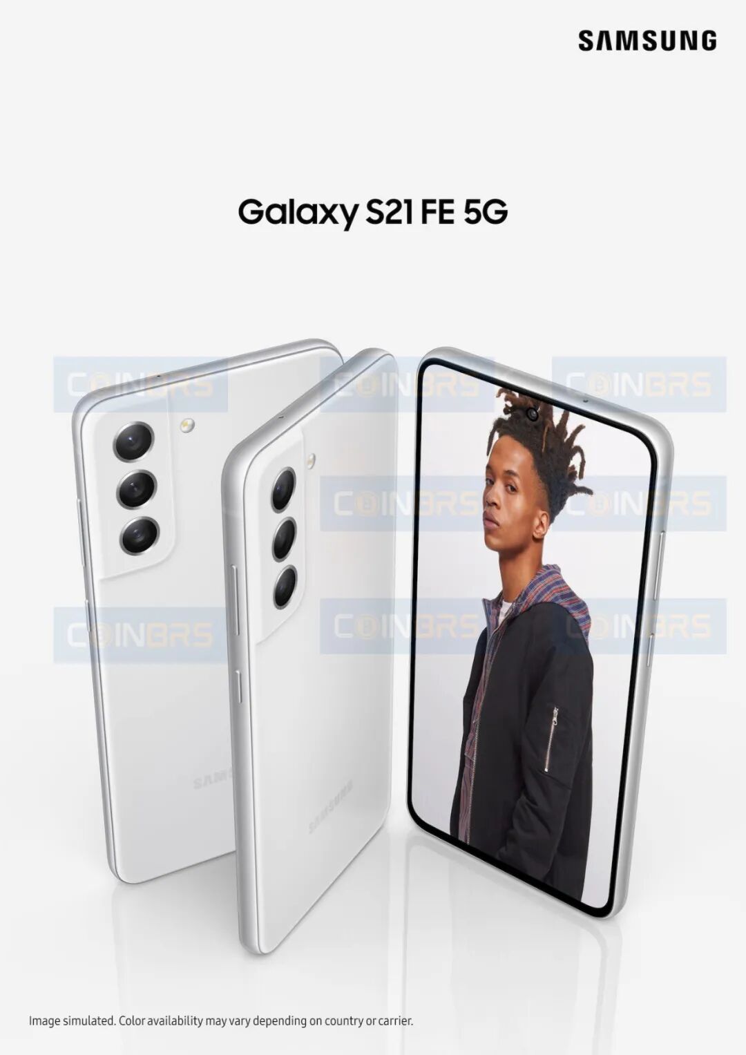 曝光的三星Galaxy S21 FE真机图和早前爆料一致,居中单挖孔直屏,背部矩形三摄,整体设计ID和S21一样。一同曝光的还有三星S21 FE的真机海报,显示其主要有芥末绿、白色、紫色、黑灰色4个配色。