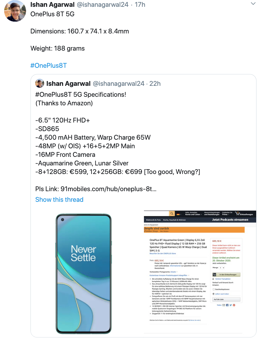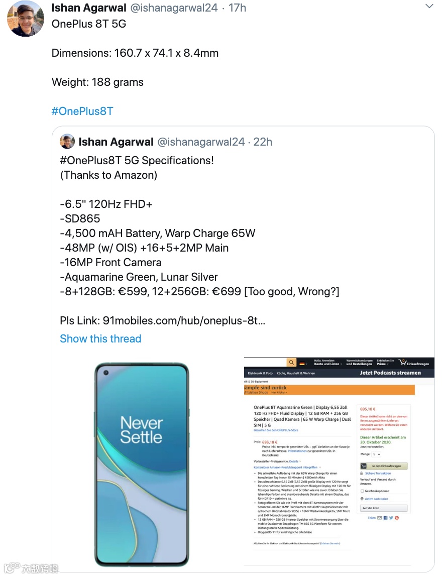 作为补充,最新爆料显示一加8T的机身三围为160.7*74.1*8.4mm,重188g,作为拥有4500mAh电池容量的865旗舰,这个机身厚度和重量大家觉得还OK吗?