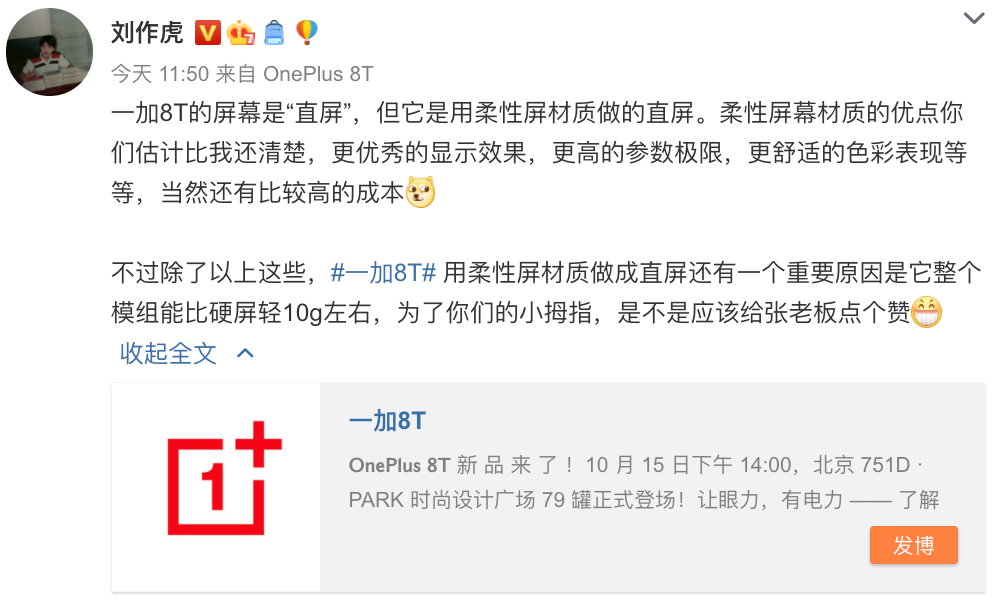 一加手机创始人虎哥还表示由于柔性直屏整个模组也轻了10g,所以延续上一代轻薄机身肯定是OK的。