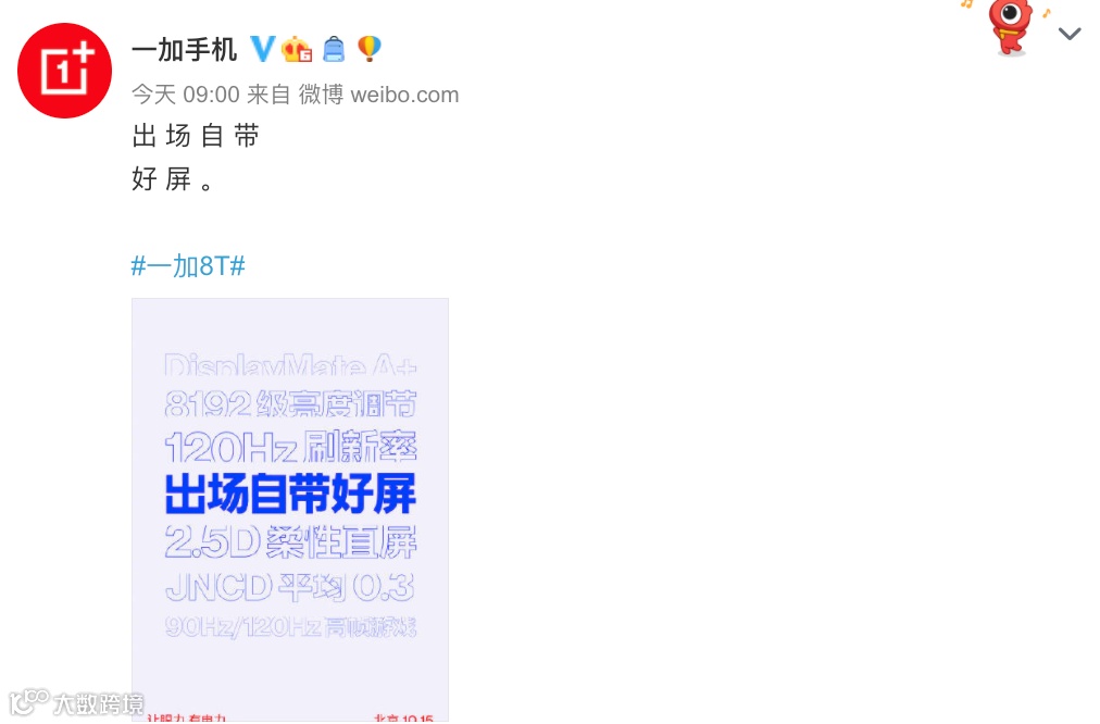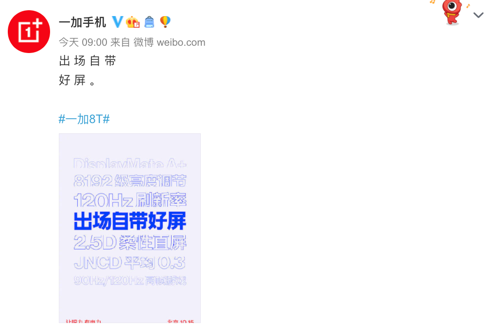 日前,一加8T正式官宣将于10月15日下午14点发布,在宣布8T的到来后,官方也开启了陆续预热,本以为其就是realme X7 Pro那块屏,但从官方预热来看,似乎并不是,而是有进一步调教。