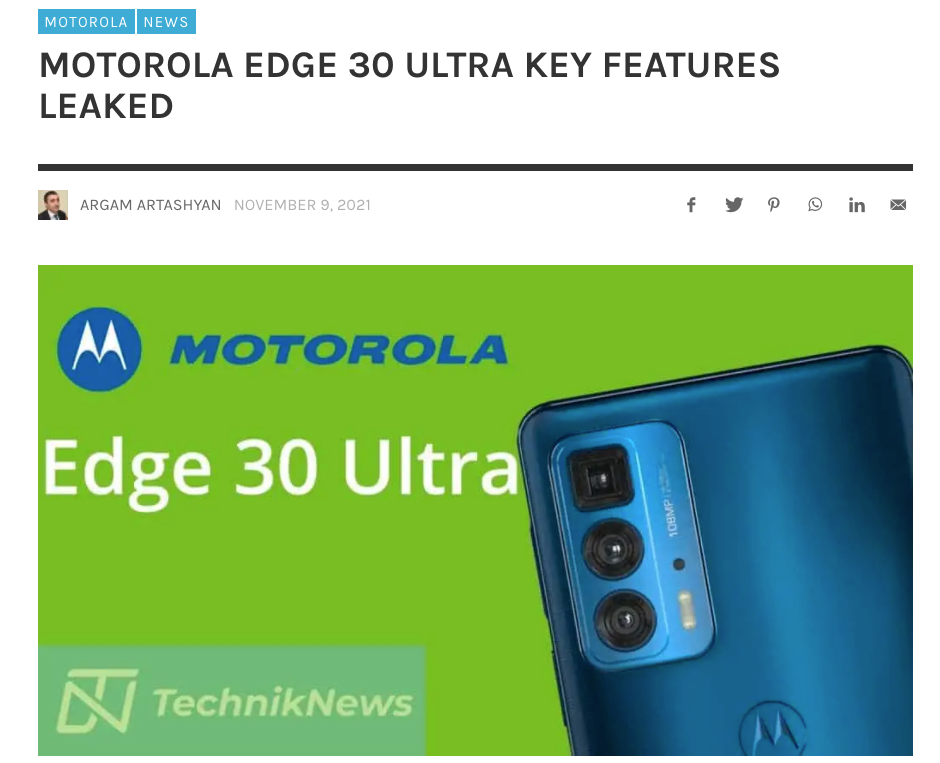 现据TechnikNews报道称摩托罗拉Moto Edge X海外版命名或为Moto Edge 30 Ultra,型号为XT-2201,内部代号“Rogue”/“HiPhi”,该媒体还披露了详细的规格参数。
