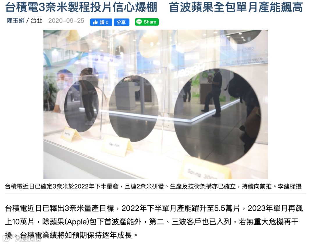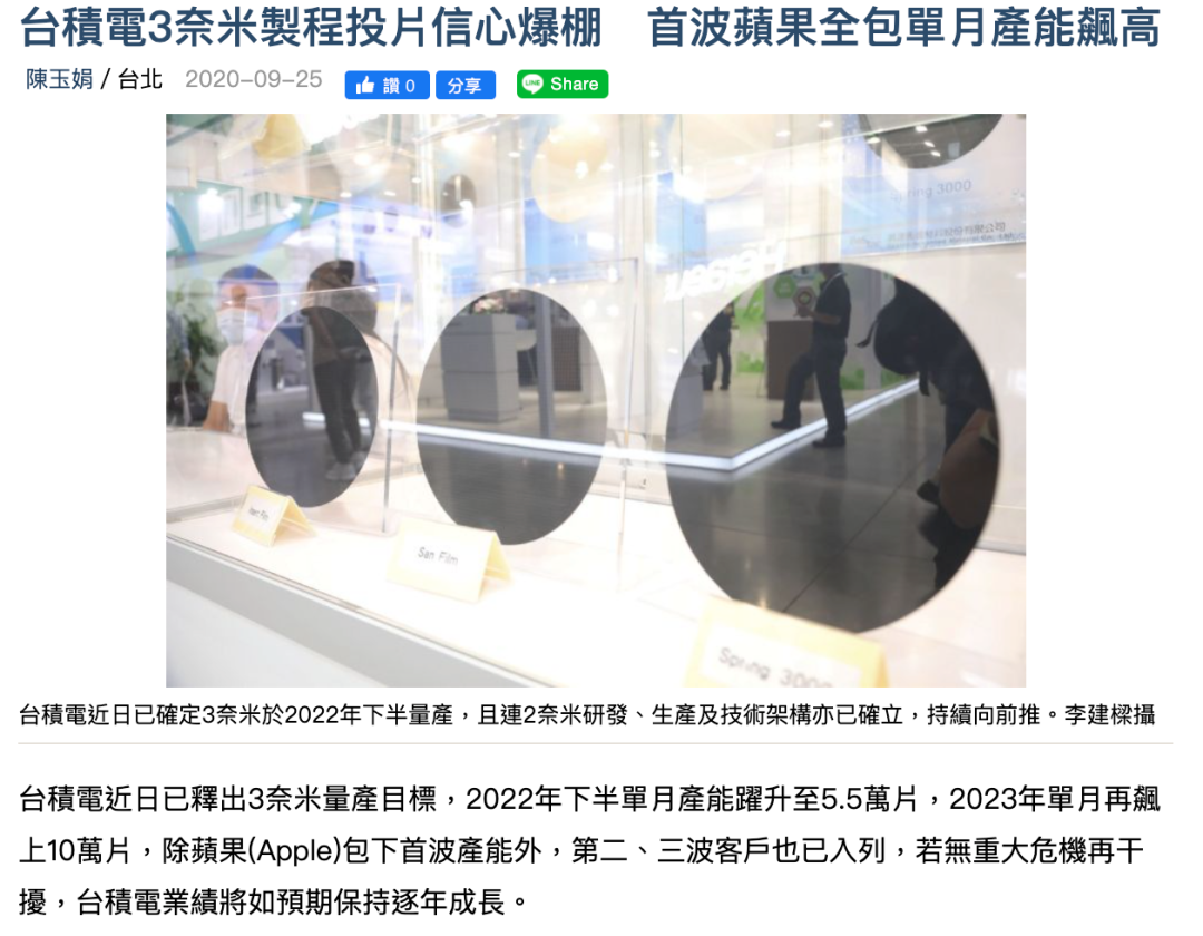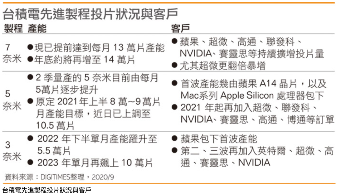 目前首波5nm产能由苹果iPhone、iPad Air所搭载的A14,以及Mac系列Apple Silicon处理器所包下,2021年起则陆续再加入超微、联发科、NVIDIA、赛灵思、高通、博通等订单。而将于2022年量产的3nm除苹果包下首波产能外,第二、三波还将加入英特尔、超微、高通、赛灵思、NVIDIA等。