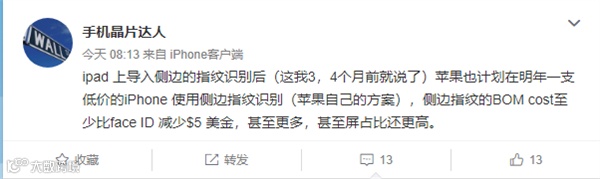 据@手机晶片达人 爆料,苹果计划在明年一款低价的iPhone 使用侧边指纹识别(苹果自己的方案),侧边指纹的BOM cost至少比face ID 减少$5 美金,甚至更多,甚至屏占比还更高。