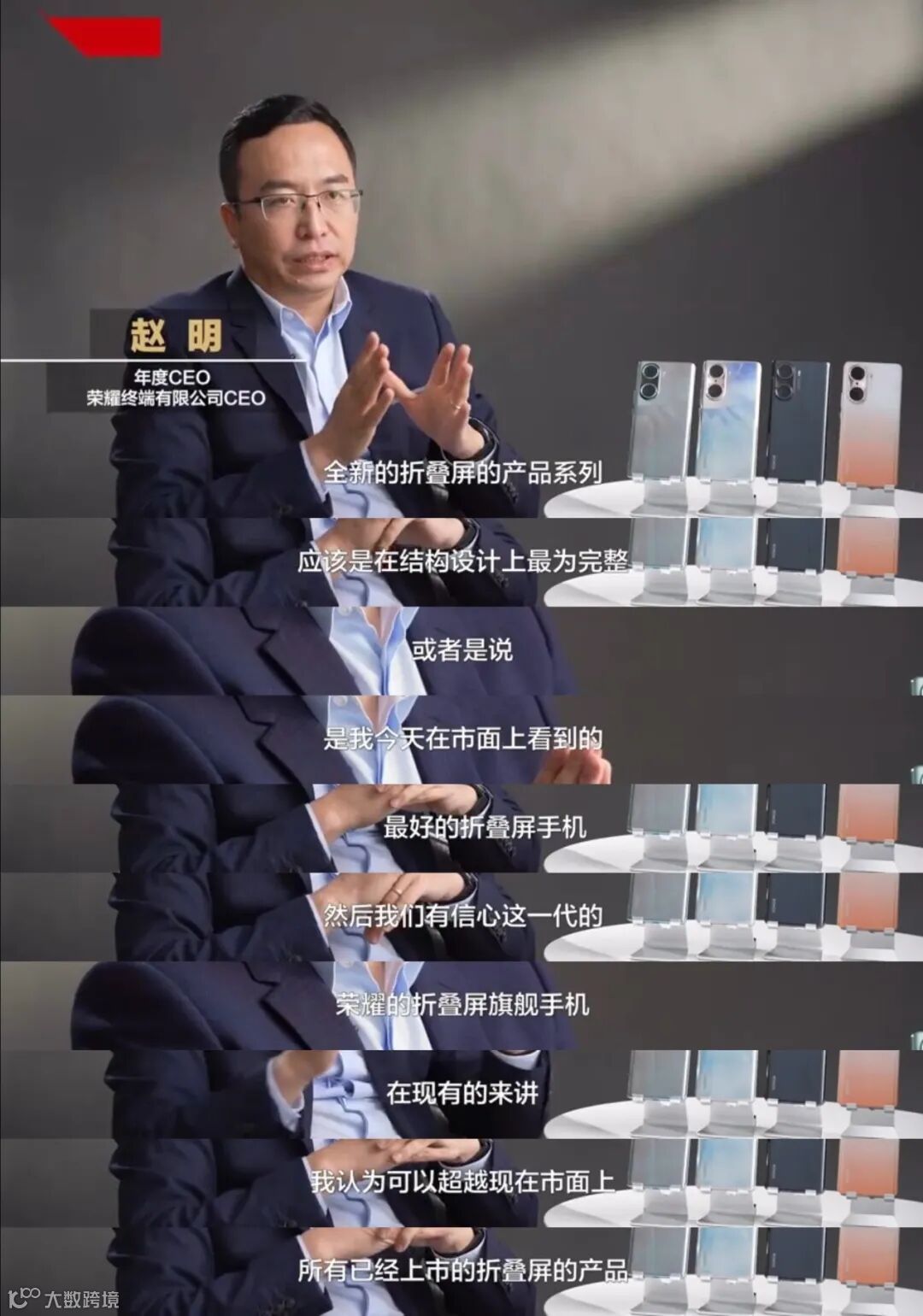 与此同时,荣耀另一边还预热了荣耀首款折叠屏旗舰「荣耀Magic V」即将发布,荣耀官博发布了一则赵明接受中国新闻周刊采访的视频,视频中,赵明表示“现有的来讲,认为(MagicV)可以超越现在市面上所有已经上市的折叠屏产品。”。