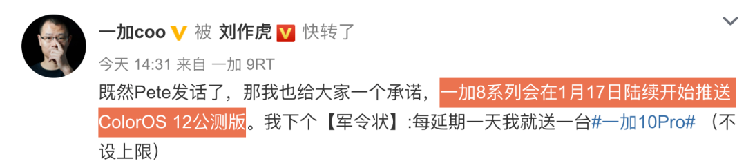 与此同时,一加COO/一加研发负责人刘丰硕也发文表示:给大家一个承诺,一加8系列会在1月17日陆续开始推送ColorOS 12公测版。下个军令状:每延期一天就送一台一加10Pro(不设上限)。且看官方具体推送日期吧~
