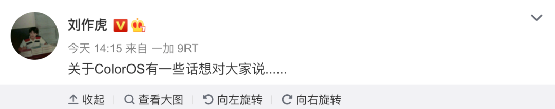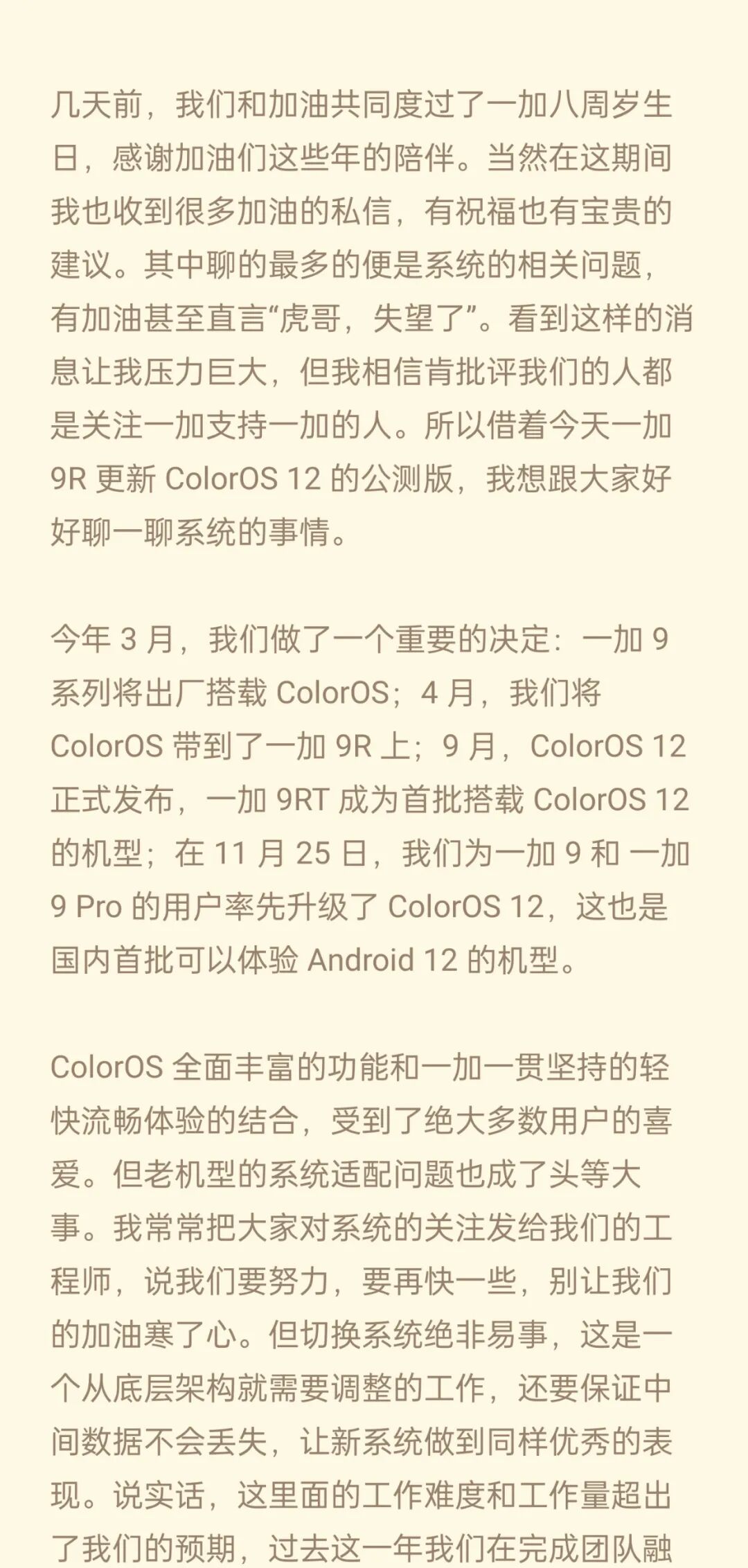刘作虎在长文里表示借着「今天开始一加9R用户将陆续更新到ColorOS 12的公测版」的日子,好好跟大家聊聊系统的事情,并表示未来会坚持死磕系统流畅度,让ColorOS在全面好用的同时变得更加轻快流畅,还准备了一些惊喜,很快就能在一加10 Pro和大家见面。