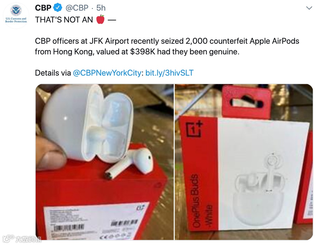 今天有一条新闻让人哭笑不得,CBP(美国海关边境保护局)官方推特账号发文炫耀称其截获一批假冒的AirPods,结果一看图片发现是一加的OnePlus Buds。。。