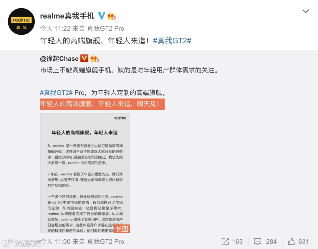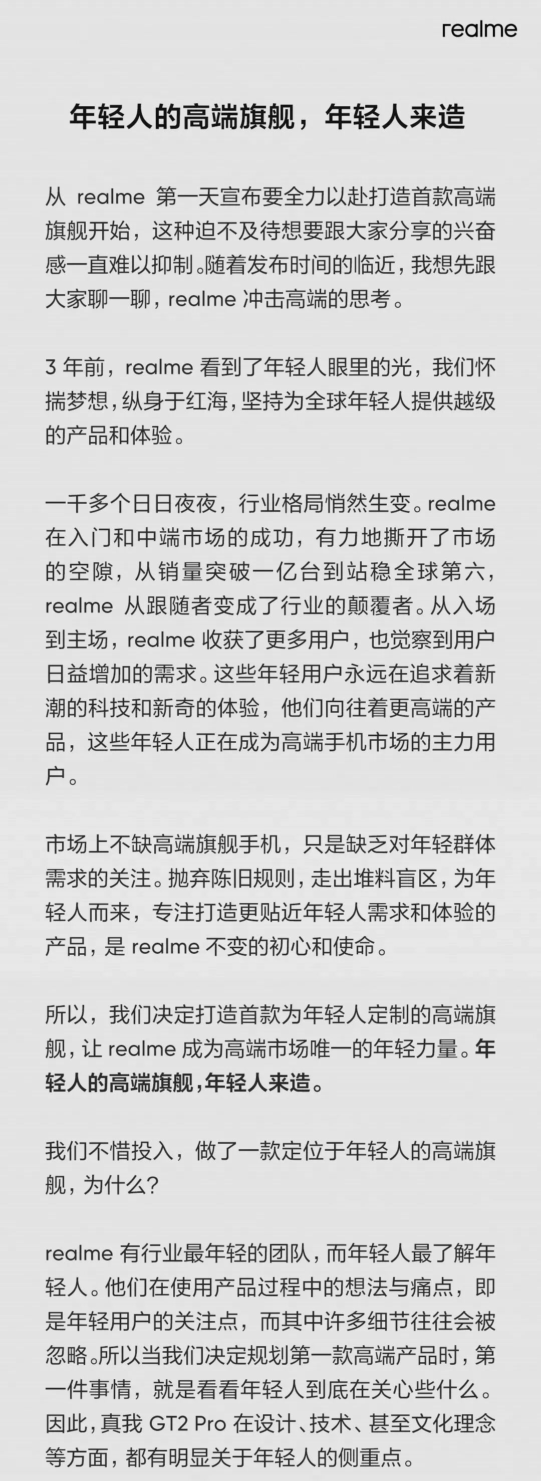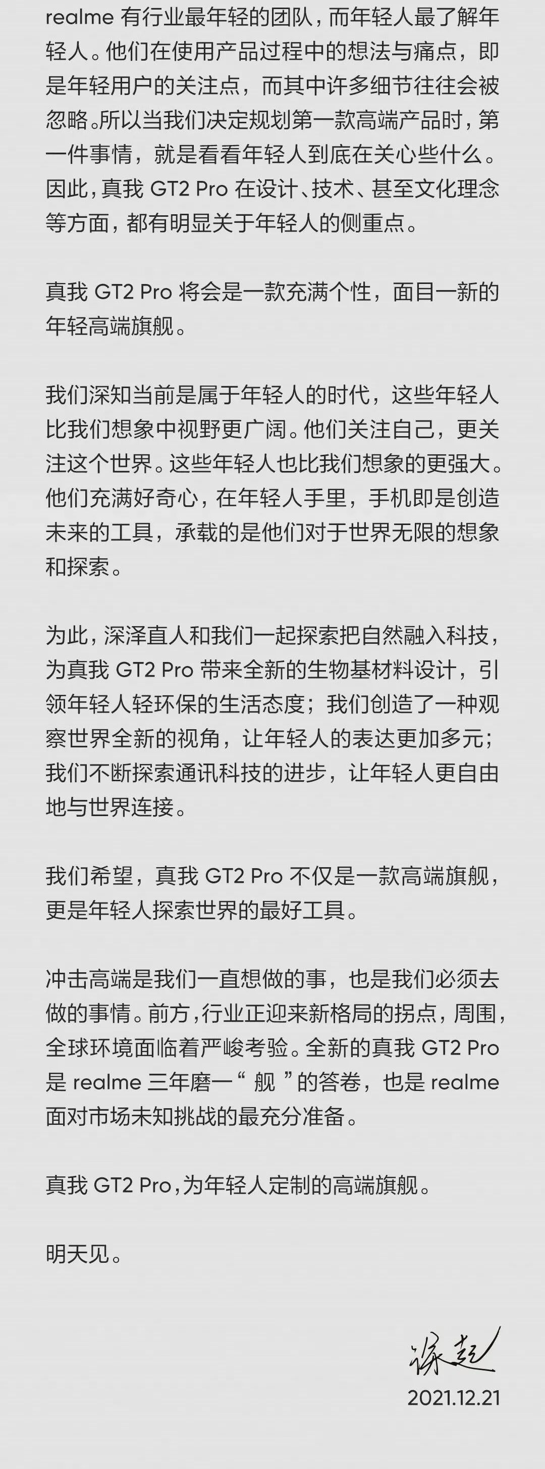 realme高管还发长文预热了realme真我GT2 Pro。