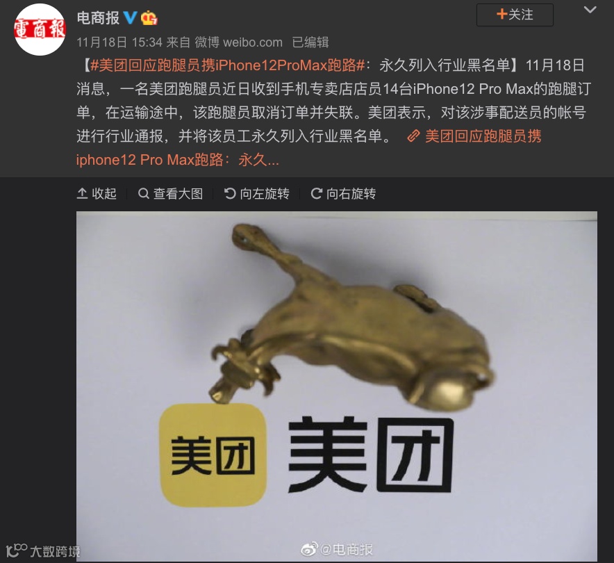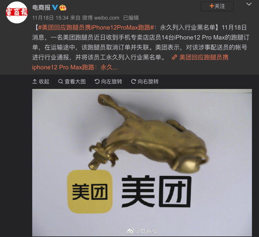 苹果旗下的iPhone系列新品给很多人的印象就是价格高昂,没想到最近还发生了一起见财起意的社会新闻。据红星新闻报道,贵州贵阳南明区亨特城市广场一苹果授权店店员11月14日在“美团跑腿”上下单,将装有14部全新的型号为iPhone 12 Pro Max手机的包裹交给“美团跑腿”的跑腿小哥唐某,让其将货品送到另一家苹果门店。