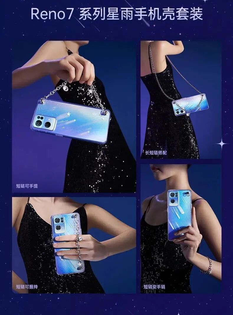 具体星雨手机壳套装里还有一个长短金属链条⛓,官方还特别介绍有四种戴法:长链可斜挎、短链可手拎、短链可握持、短链可当手链;而定制的星空灯外观是星雨心愿渐变色,同时配赠流星宝藏星空投影灯片。