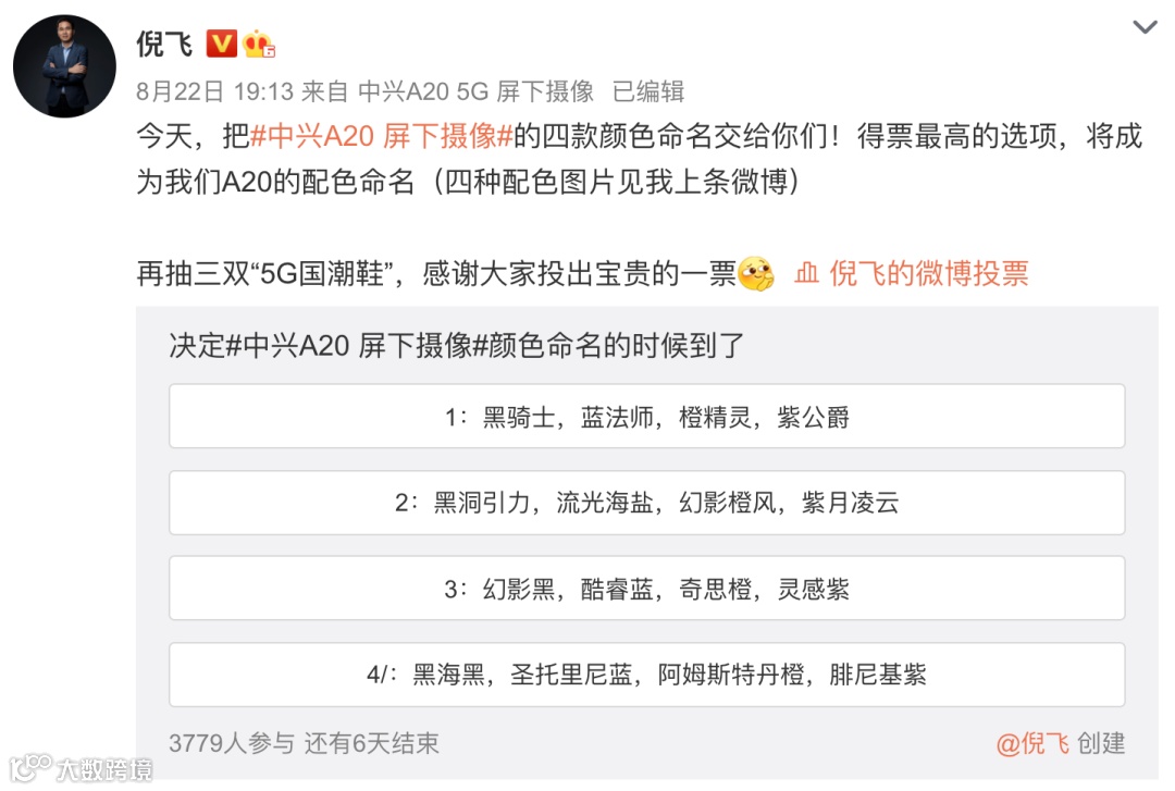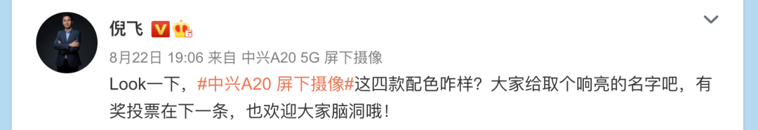 倪飞总还发文号召大家投票决定中兴A20这四款配色的正式命名,小白个人喜欢2或3,不知道大家会选哪个?