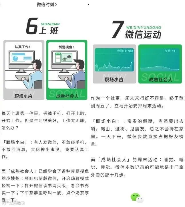 另外想跟大家聊聊小白昨天看到的一篇文章,来自腾讯微信官方认证号「微信时刻」的一篇主题为“社会人「成熟」的标志,是置顶工作群”的文章,该篇文章通过对比职场小白和成熟社会人使用微信的不同风格,似乎想宣传微信办公,但小白看了觉得心里反而满是憋屈。