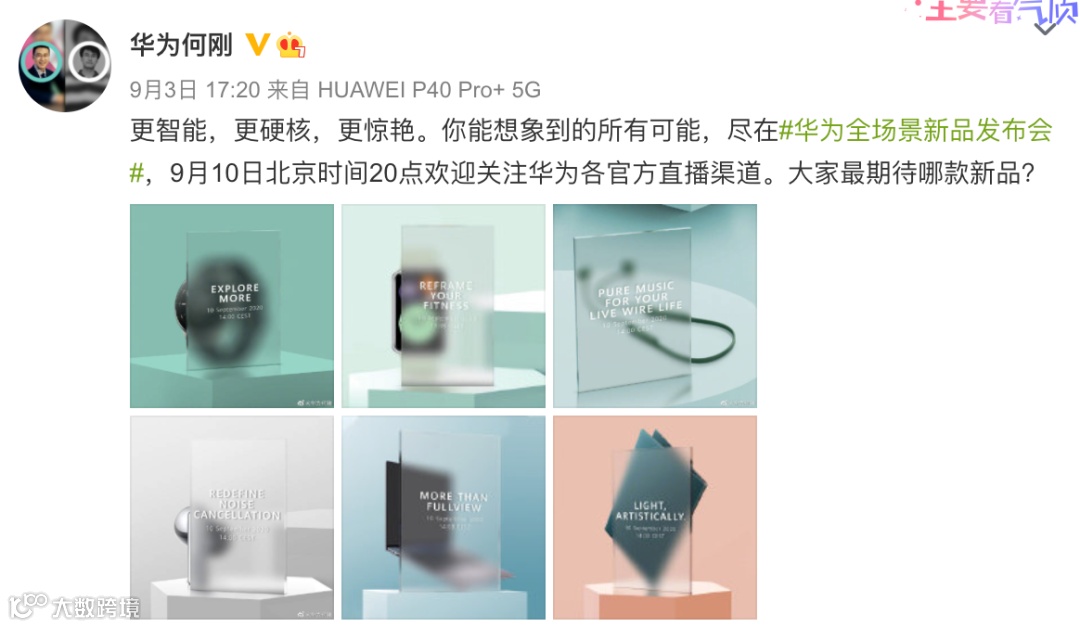 不过华为在9月10日晚上20点还有一场「华为全场景新品发布会」,昨晚华为消费者业务手机产品线总裁何刚还在微博晒出了新品预热图,从海报来看华为发布会将会带来6款新品,智能手表、蓝牙耳机、笔记本电脑各2款。图1到图6应该依次是: