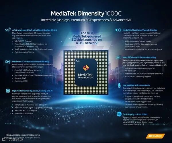 规格上,天玑1000C CPU采用4*A77+4*A55@2.0GHz,GPU采用Mali-G57,最高支持12GB LPDDR4X RAM,以及UFS 2.2 ROM。据了解其主要面向美国地区。