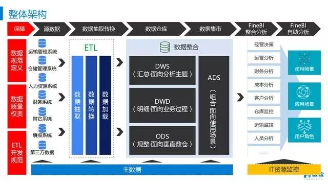 这里我以FineBI为例子,FineBI的技术架构从源数据对接、数据抽取转换、数据仓库、数据集市,到整合分析、自助分析,通过制定严格的数据规范定义,建立和保障完善的数据质量权责体系,完整的FineBI交通物流运输行业大数据技术应用架构如下图所示: