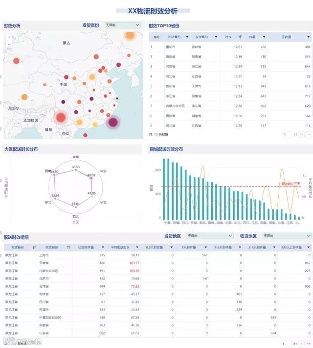 物流时效分析,同样也是作为物流看板的补充:比如各个省份地区,哪些省份物流时效最高,时效低的又是哪些省份,分别有什么特征?不同大区是否有明显物流时效差异,是否和地区基础物流建设水平有关?同城配送平均时长超过三天的有哪些地区,分别是什么因素导致的,如何改进?这一点可以通过FineBI构建快递流时效看板,按照不同地区配送时效统计分析数据,关键指标一目了然。