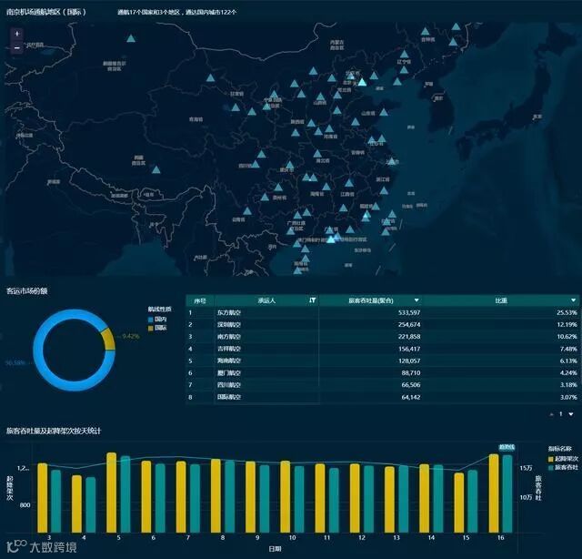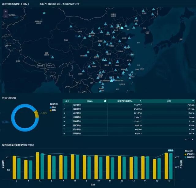 对于航空运输领域而言,需要关注以下问题:分析机场覆盖有哪些国家和通航地区,对应地区的机场数量有多少?国内和国际的客户市场份额占比如何,对应承运的航空公司分别有哪些,旅客吞吐量和比重分别是多少?不同月份的起降架次和旅客吞吐量走势如何,什么时候是航空出行高峰期?对于航空管理部门来说,通过FineBI可以快速构建航空运输管理看板,按照不同承运的航空公司进行吞吐量等数据的统计分析。