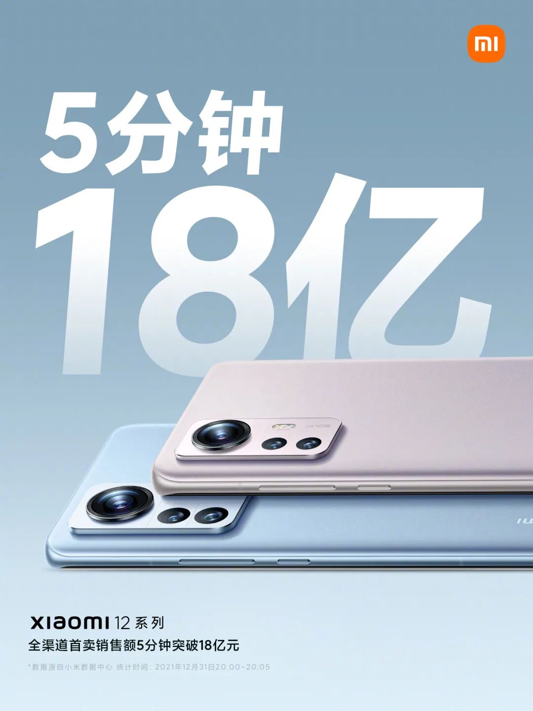 如上图所见,官方表示12月31日20点开售,截至20:05,小米12系列全渠道首卖销售额5分钟破18亿元。